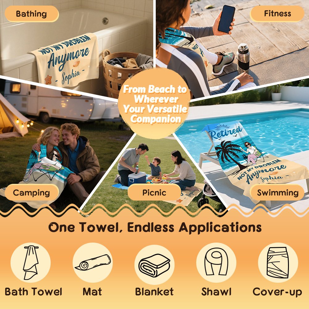 Tässä rantapyyhkeessä on rantalomateema, jossa sarjakuvahahmo nauttii rentouttavasta hetkestä kookospähkinäpuun alla ja esittelee eläkkeelle jäämisen iloja. Leikkisä iskulause "Retired Not My Problem Anymore" kuvaa täydellisesti eläkkeelle jäämisen huolettomuutta. Mukautettavat nimet tekevät tästä rantapyyhkeestä ainutlaatuisen ja luovat todella erityisen kesäisen asusteen.